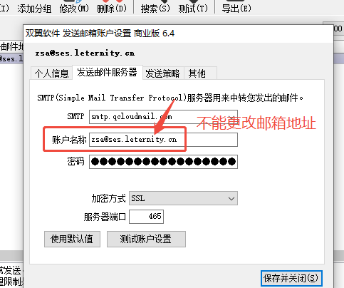 添加发件箱时,账户名称这里,本应该是邮箱地址,改为 中文名称,导致发信时链接失败。
